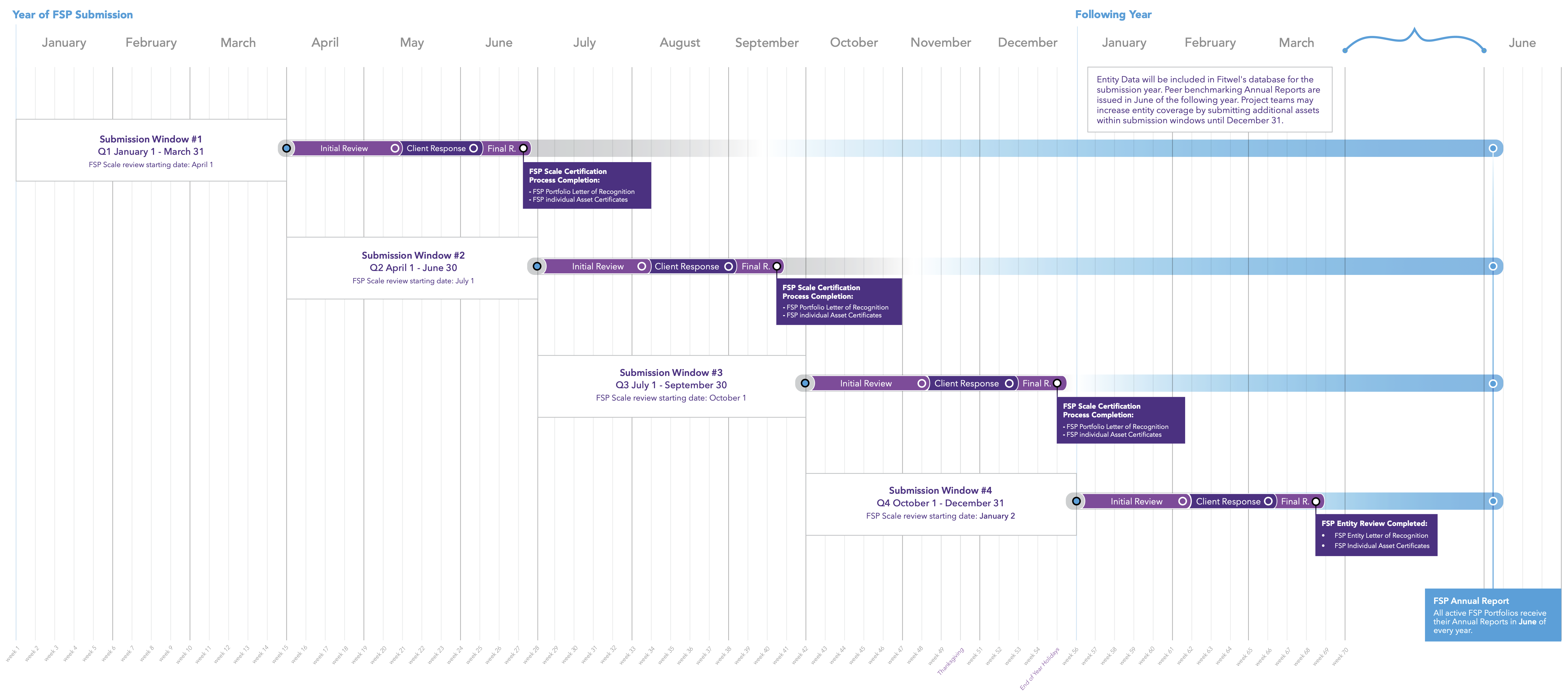 All assets will be included as part of the peer data set, which will be incorporated into Fitwel's database for the current submission year. FSP Annual Reports are issued in June of the following year. Please refer to the timelines below.